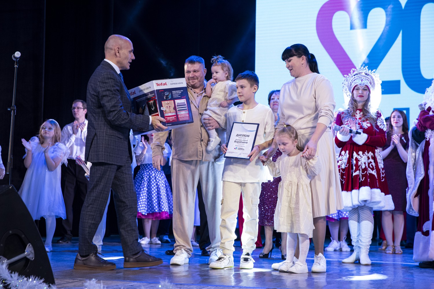 Также Александр Юрьевич выполнил почётную миссию, наградив под гром аплодисментов семью Воробьевых, которые в год Семьи заняли третье место в конкурсе «Семья - Росатом». Дмитрий и Елена Воробьевы вместе с детьми поднялись на сцену и получили заслуженные аплодисменты от коллег и друзей.