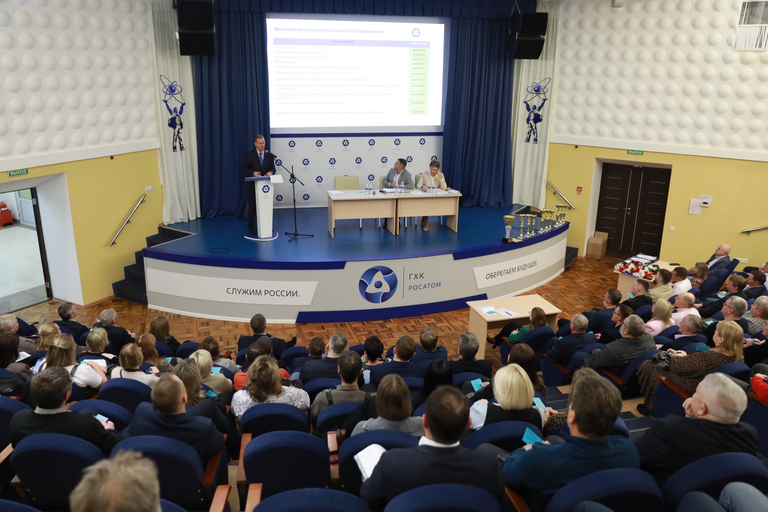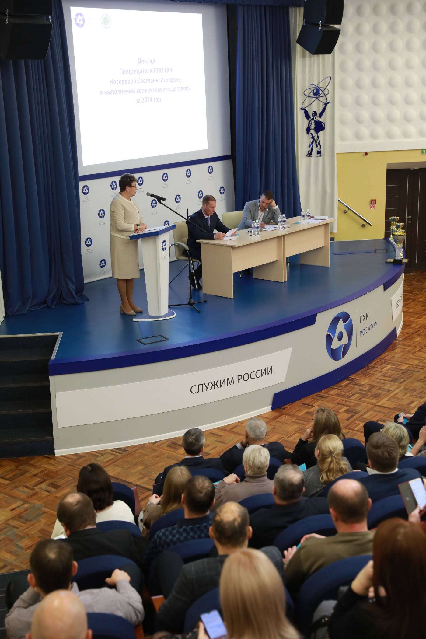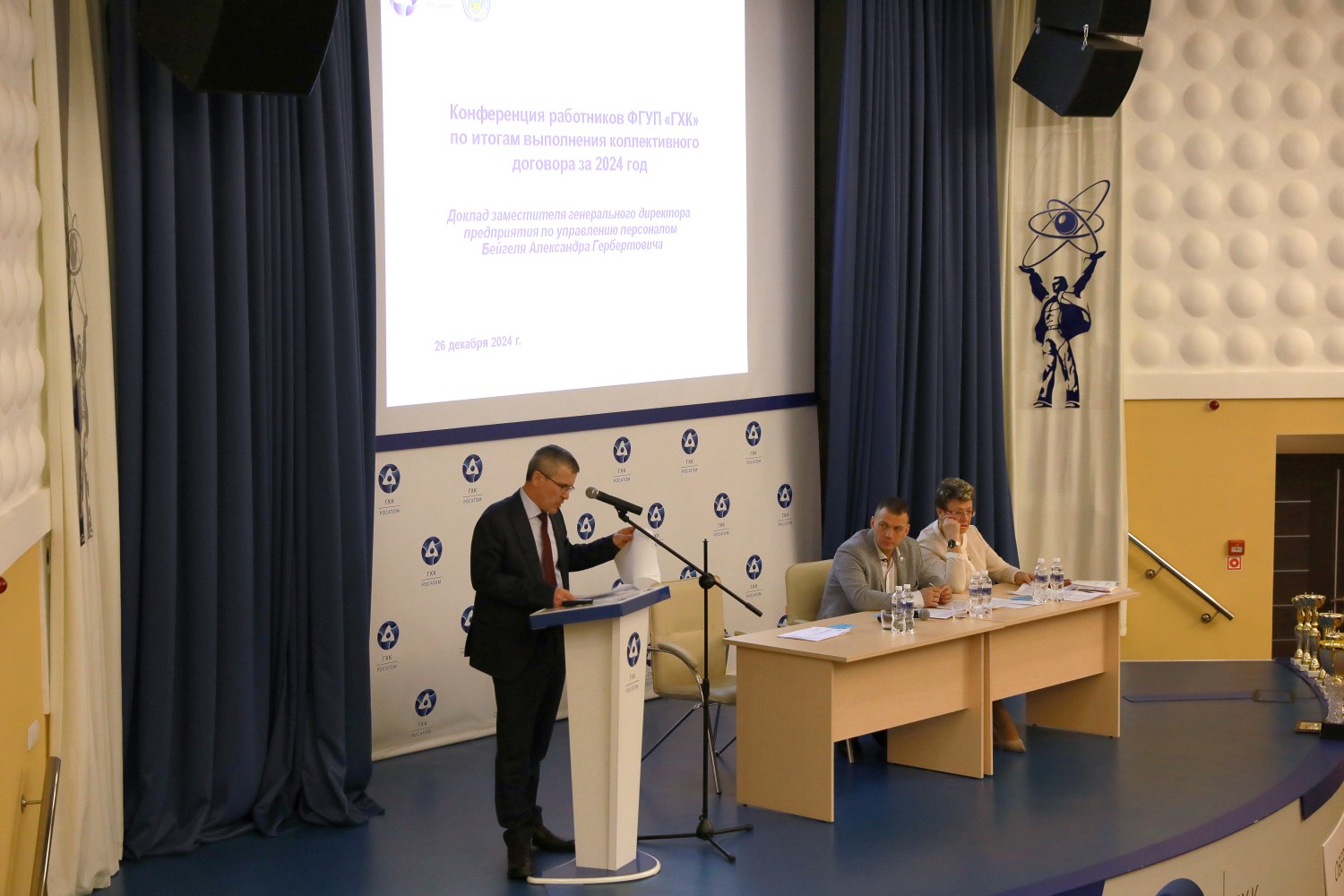 Далее слово было предоставлено заместителю генерального директора предприятия по управлению персоналом Александру Бейгелю. В своём докладе Александр Гербертович подчеркнул, что утверждённые показатели программы деятельности предприятия выполнены. Выделяются средства на проведение мероприятий социальной направленности, улучшение условий труда персонала, привлечение молодых сотрудников, на физкультуру и спорт, культурную жизнь, поддержку ветеранов и пенсионеров ГХК. Также в докладе были отмечены отличные результаты сотрудников ГХК на отраслевых чемпионатах профессионального мастерства, совместная работа с ФМБА России по модернизации городской системы здравоохранения, победы спортсменов предприятия на всероссийских состязаниях, а также победы волонтёров ГХК в региональных и всероссийских конкурсах.