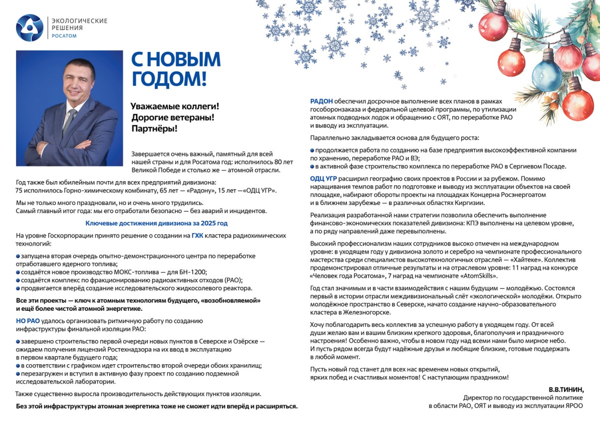 Поздравление директора по государственной политике в области РАО, ОЯТ и выводу из эксплуатации ЯРОО В.В. Тинина с Новым годом